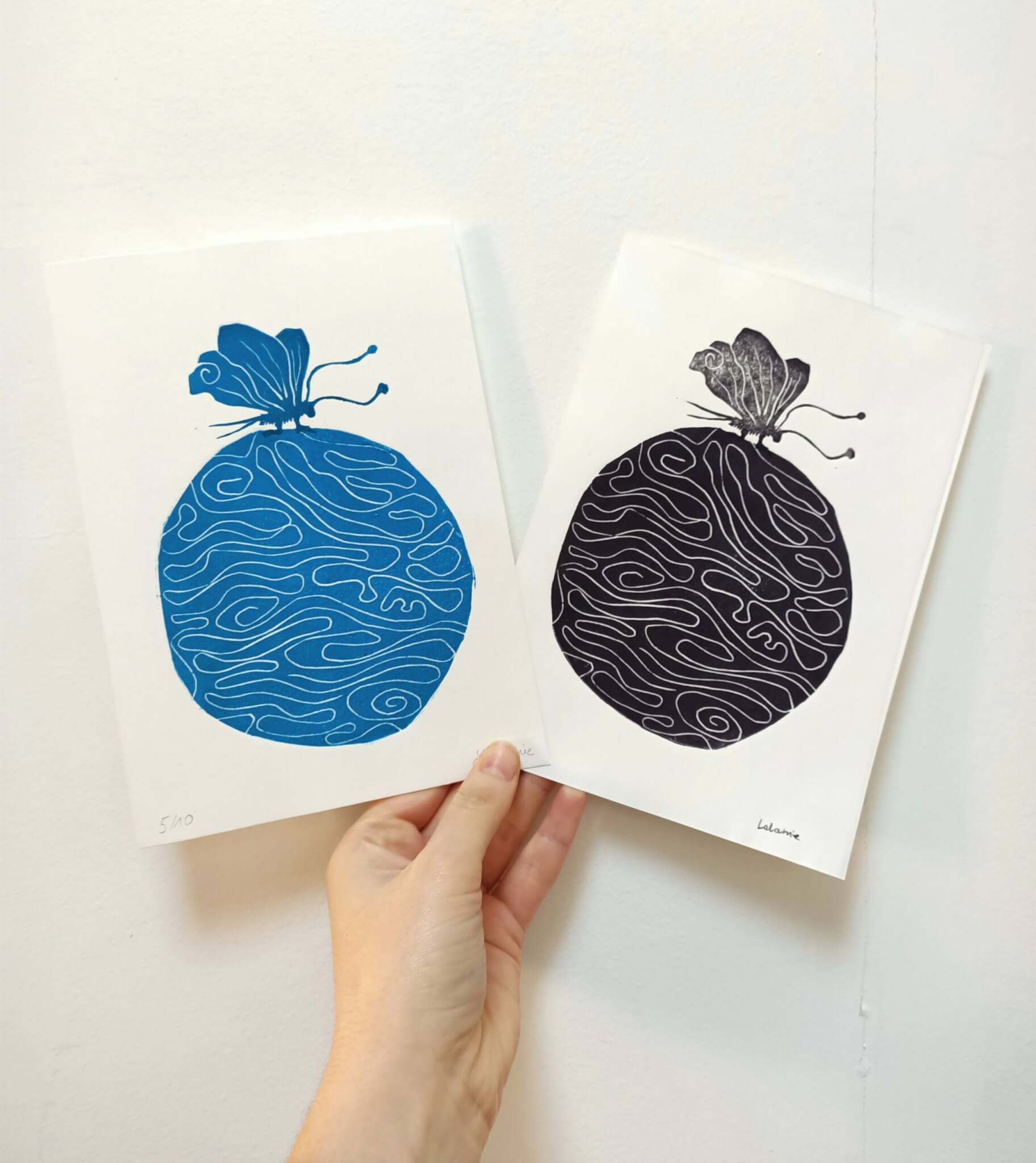 Je n’ai pas changé le prix de la linogravure, par contre il a fallu patienter le temps de ma prochaine session d’impression + le temps de séchage de l’encre (3 semaines).
