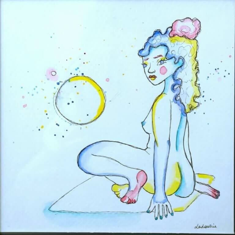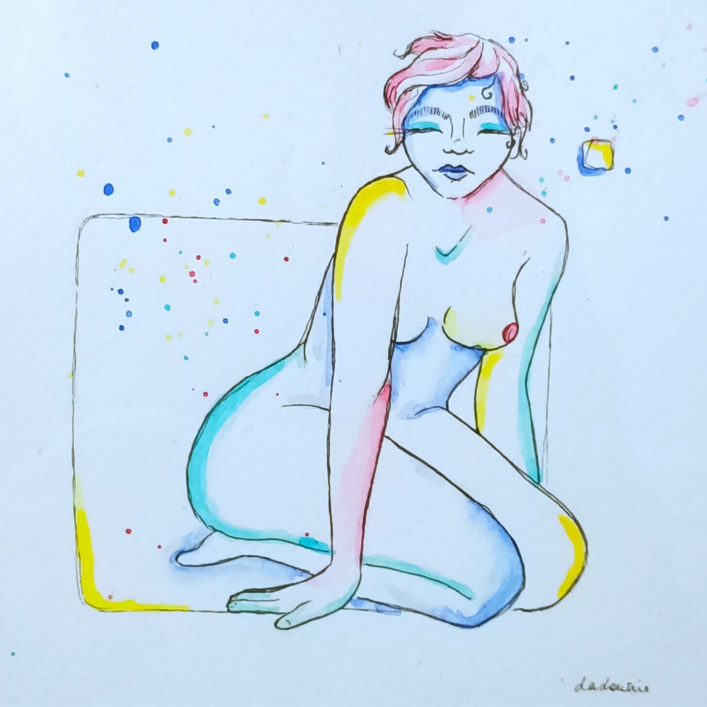 Pour la petite histoire, j’ai dessiné 5 petites dames, j’en ai retenu 4 et ma maman en a choisi 3 (en fait elle a aimé les 4 restantes mais il n’y avait que 3 cadres).