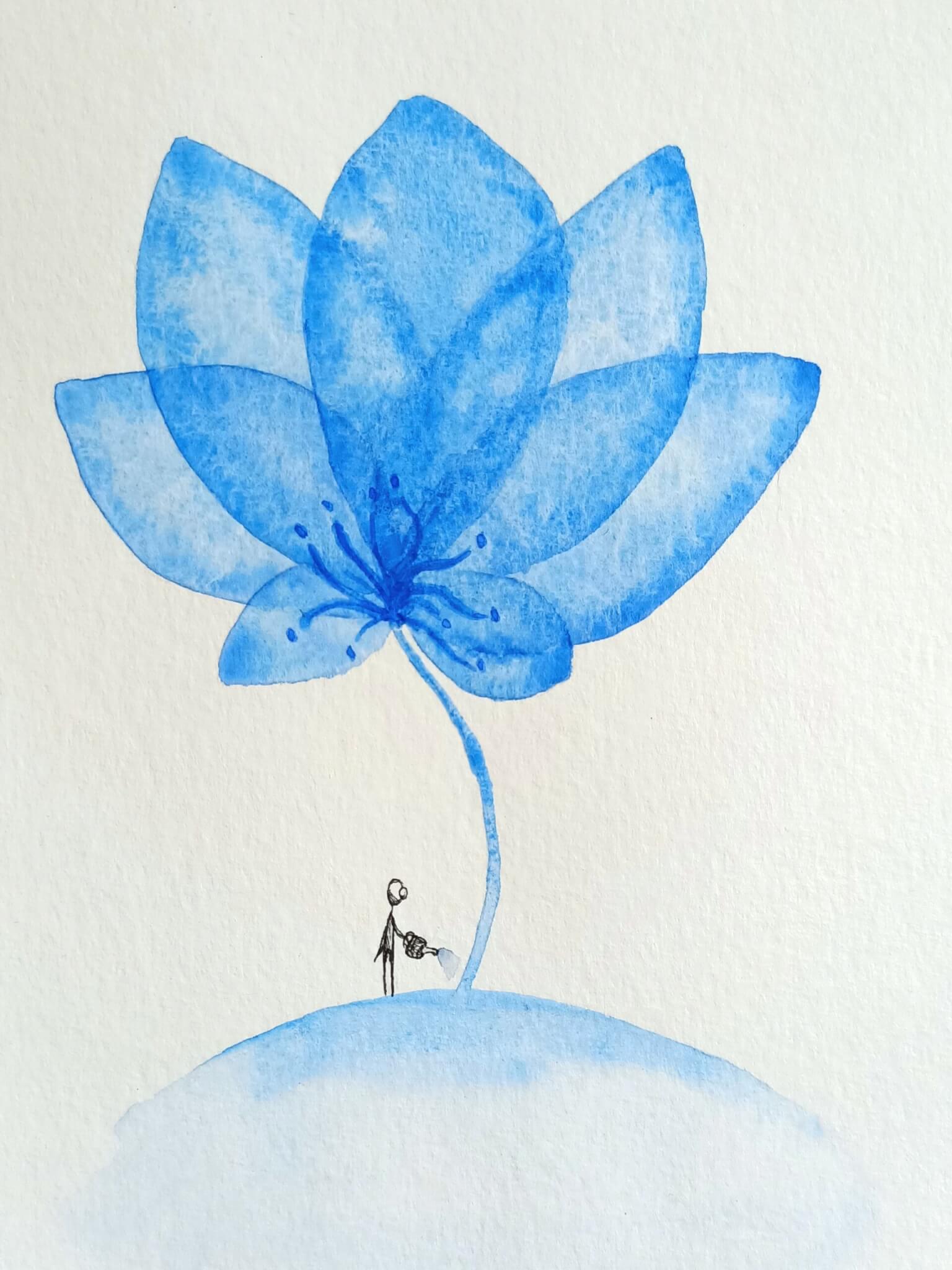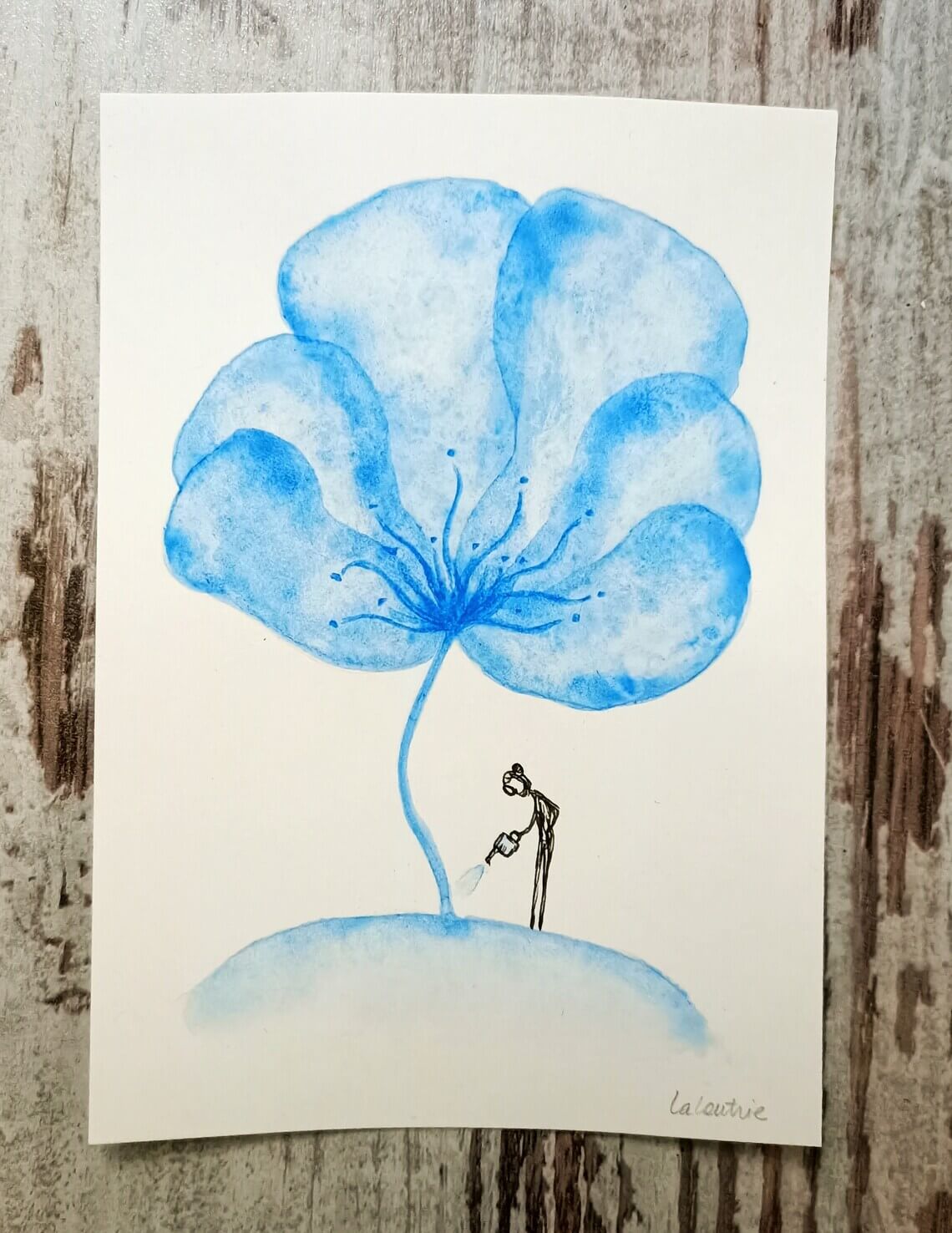 Je voudrais une fleur plus ronde, bleue et avec une petite mamie. Avec l’autre aquarelle ça…
