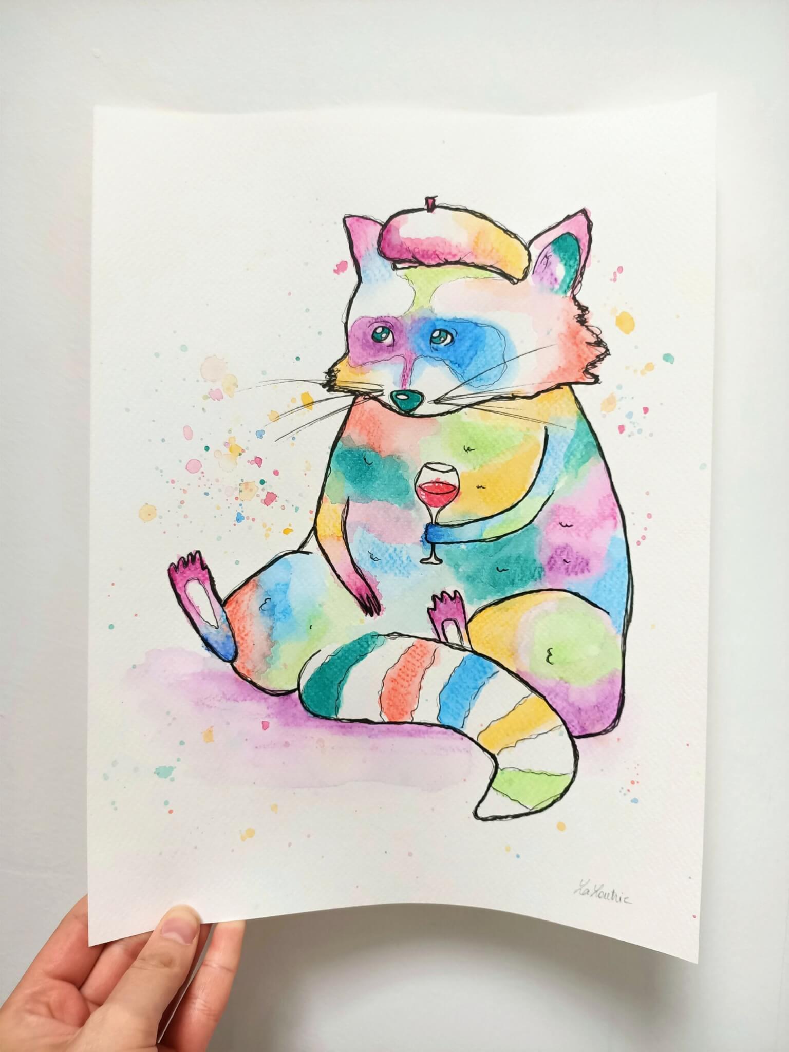 Aquarelle raton laveur buvant du vin