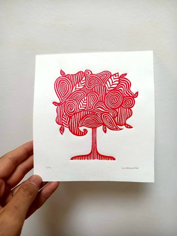 Impression originale en linogravure de L’Arbre rouge.